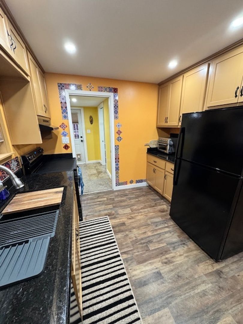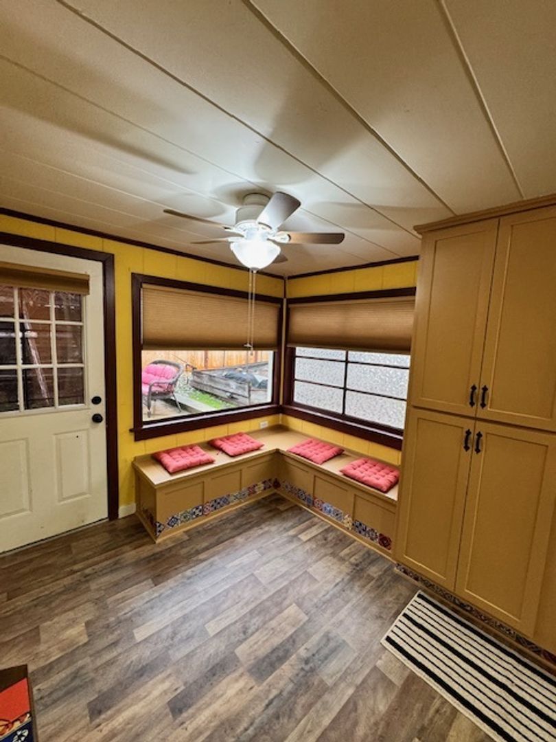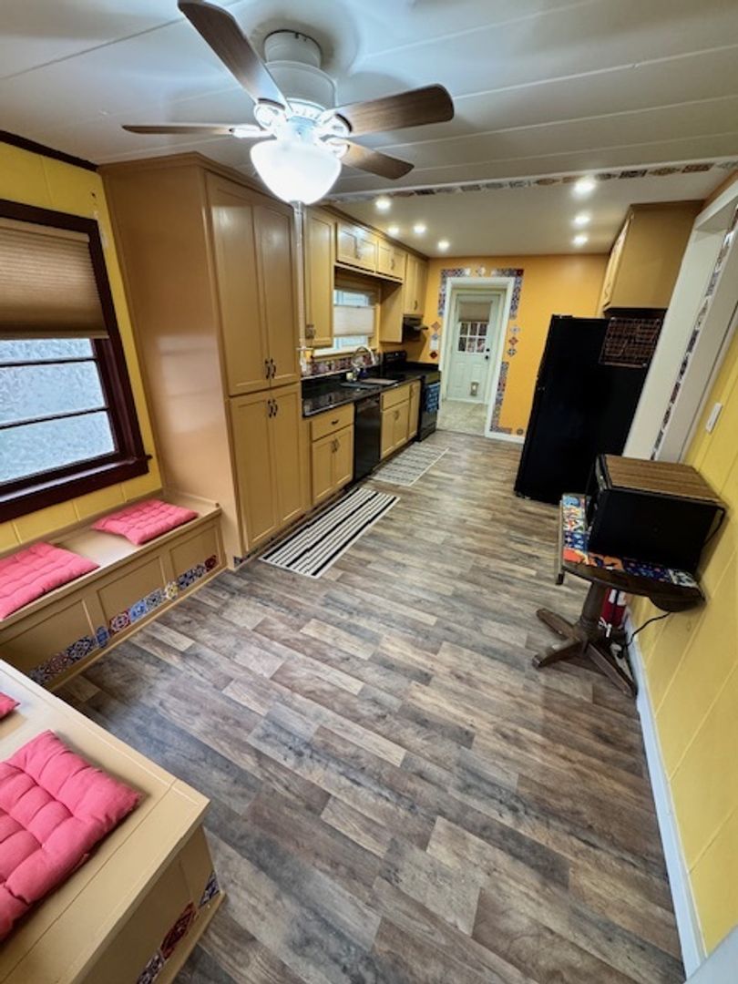 Located between both hospitals. This home features a well-equipped kitchen with a refrigerator, dishwasher, and electric stove, plus a cozy breakfast nook with built-in storage.