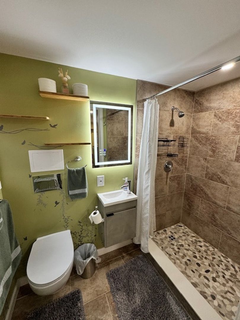 Comfort is ensured year-round with a pellet stove and mini-split system for heating and air conditioning. Washer and dryer are included.