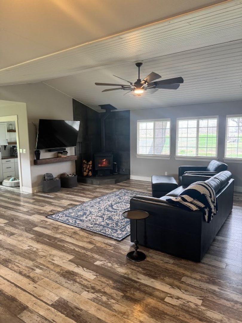 The living room is warm and inviting with a wood stove, large wall-mounted TV, and sound bar—ideal for relaxing or hosting guests.