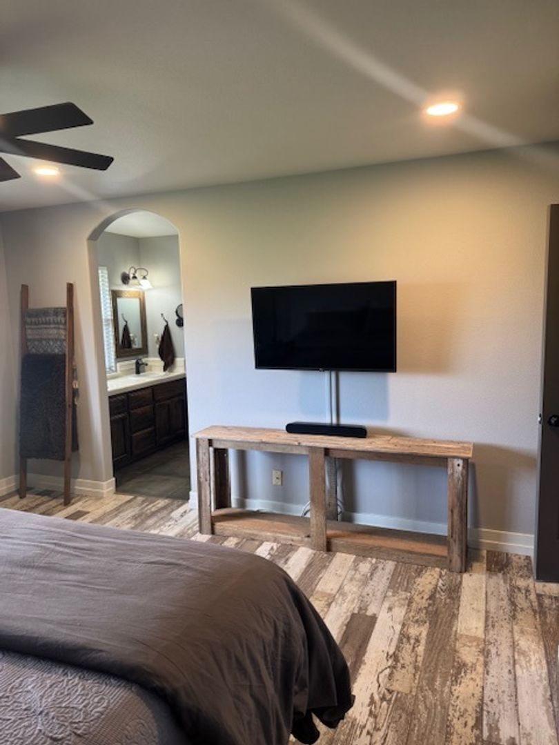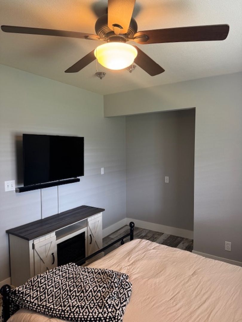 • First bedroom is lightly furnished with a wall-mounted TV, entertainment center, and optional bed.