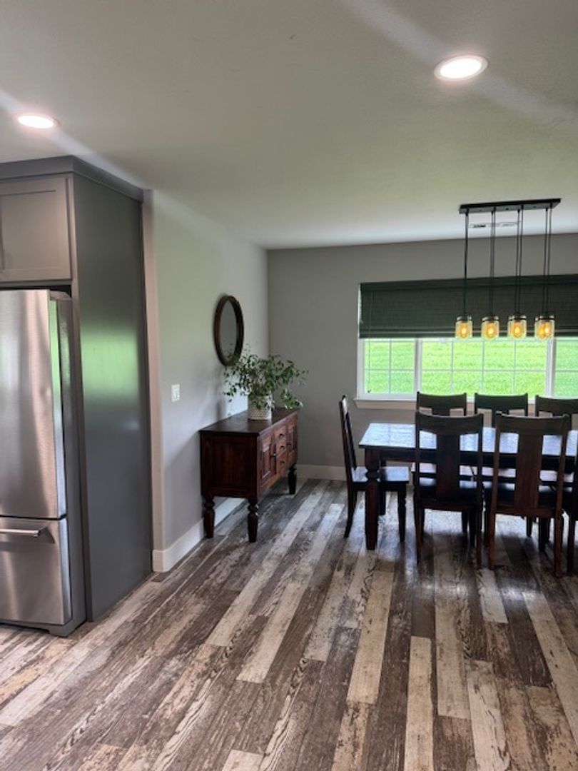 The kitchen features an island with a rolling cart perfect for entertaining and comes equipped with a refrigerator, microwave, dishwasher, and oven. Just off the large dining room is a cozy nook that makes the perfect space for a beverage or coffee bar.