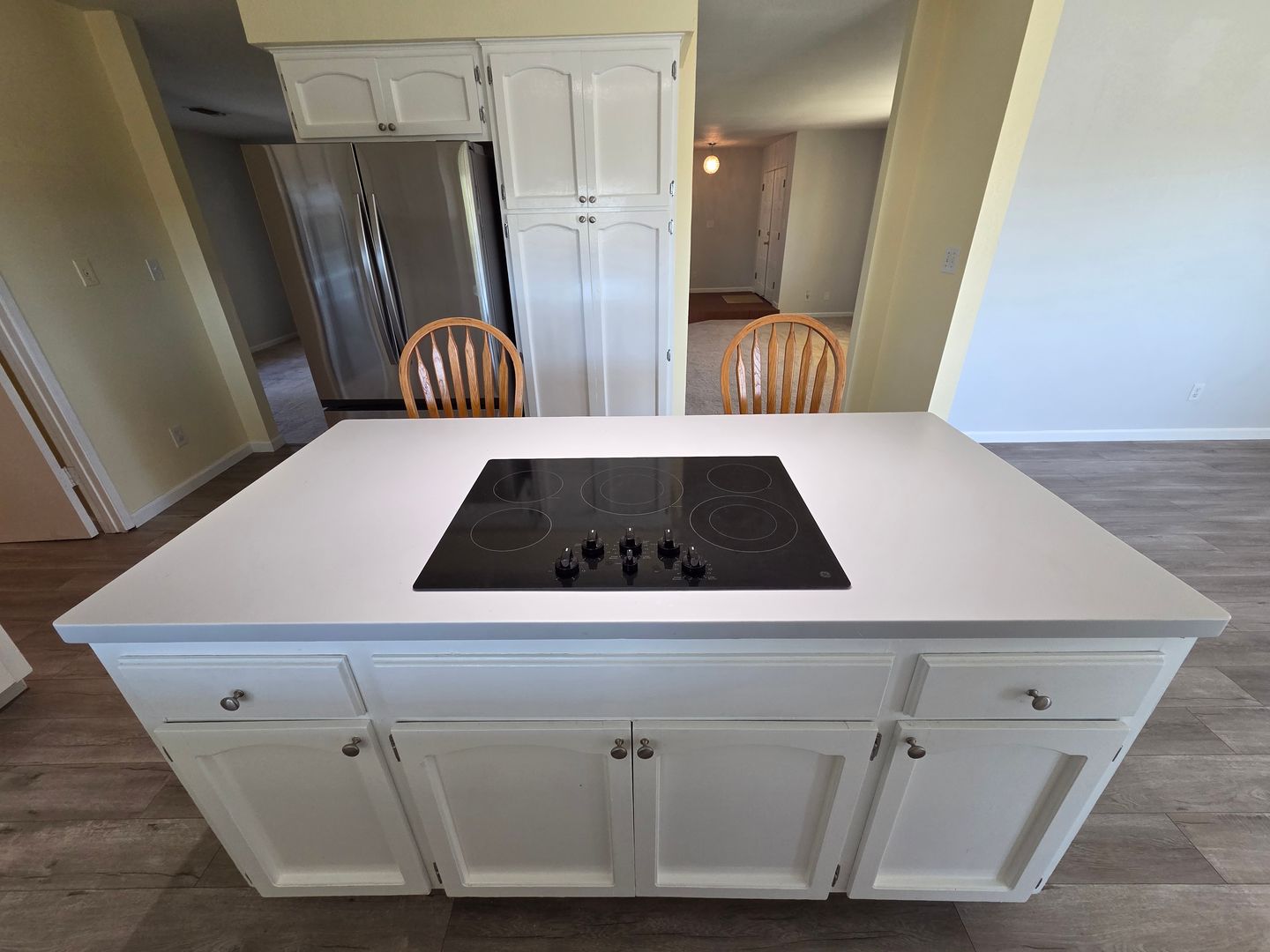 The kitchen is well-equipped with a refrigerator, wall oven, microwave, dishwasher, and a central island with cooktop, bar seating, and included bar stools. Just off the kitchen, step onto a charming balcony—perfect for enjoying morning coffee while taking in even more of the sweeping views.