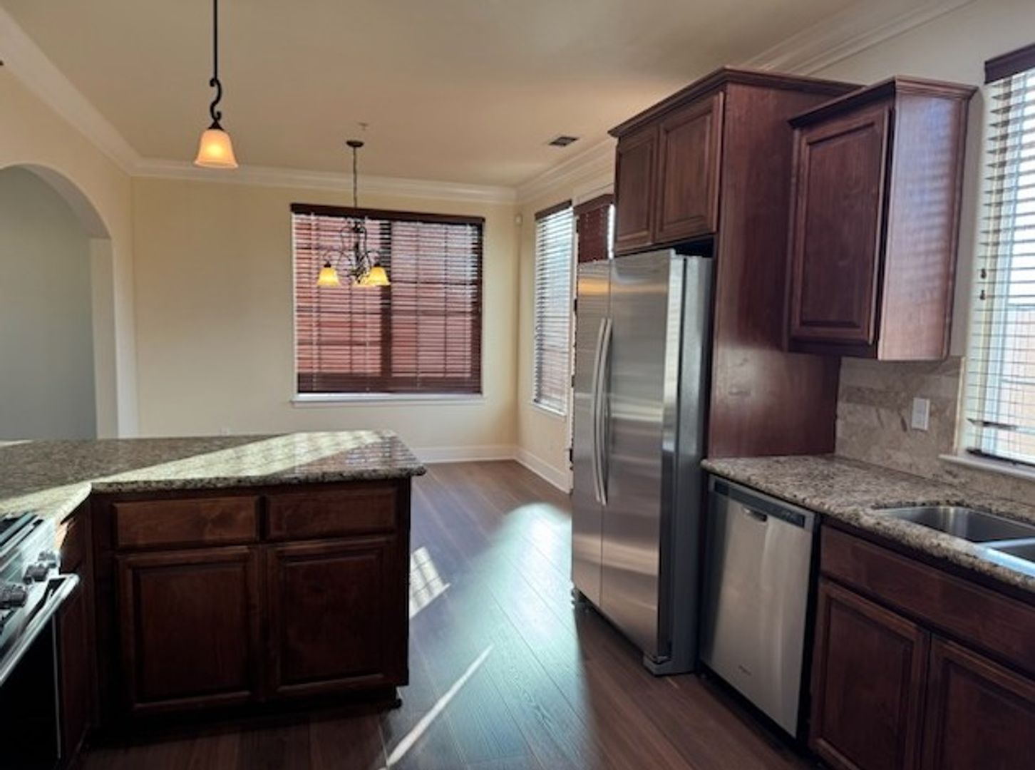 Bright, open living area featuring elegant finishes and a cozy gas fireplace, perfect for relaxing evenings or entertaining guests. The modern kitchen offers granite countertops, ample cabinetry, and a functional layout ideal for home cooking and gatherings. Appliances include a refrigerator with warranty, gas stove, dishwasher, and microwave.